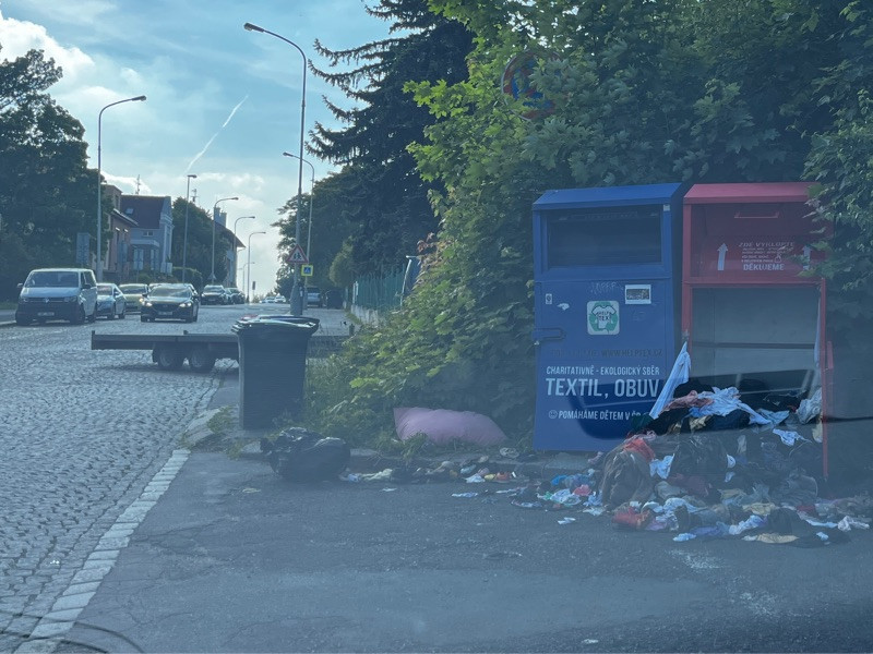 Kontejnery na pouzity textil maji poskozene panty, zamky jak je bezdomovce stale oteviraji a prehrabuji textil. Neskutecny neporadek kolem. Je treba, aby provozovatel kontejneru dal kontejnery do poradku (uzamkl) popr. vymenil ci presunul na jine spise exponovanejsi misto, kde to bezdaci nebudou vybirat.