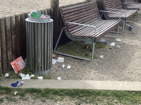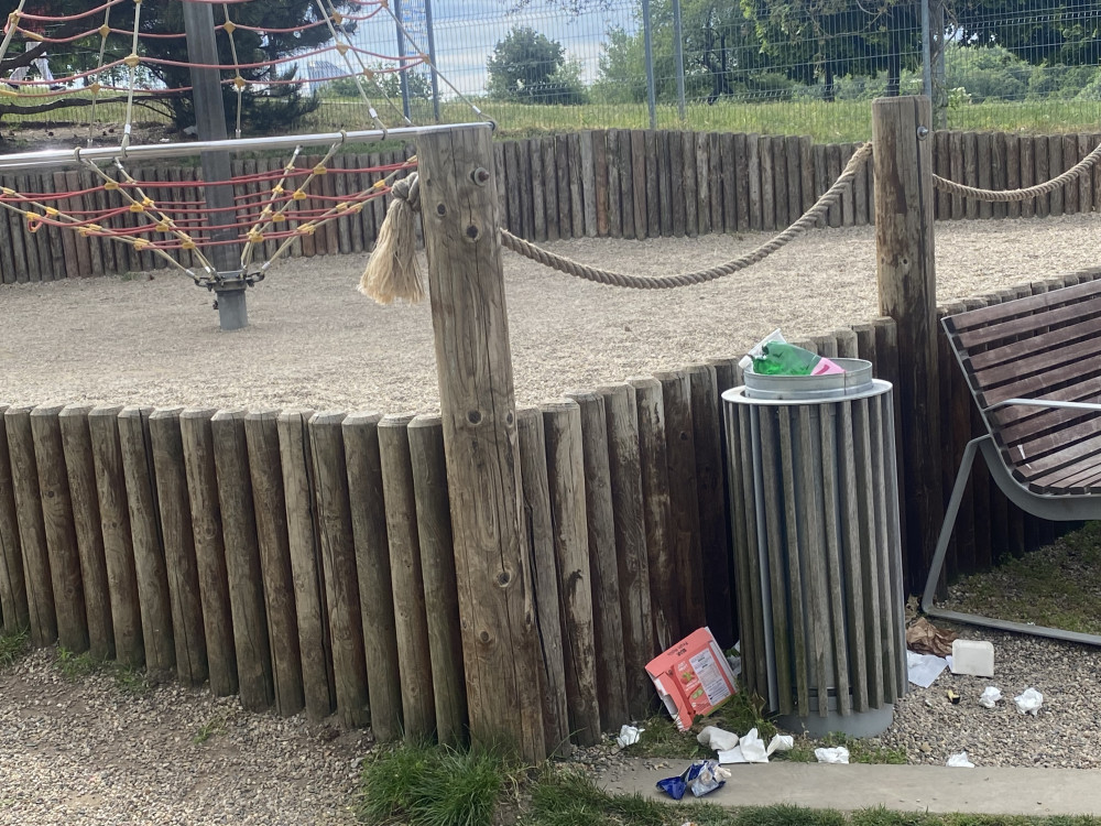 Na P3 Parukářka - dětské hřiště jsou přeplněné odpadkové koše a rozházené odpadky .