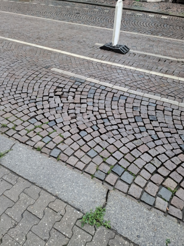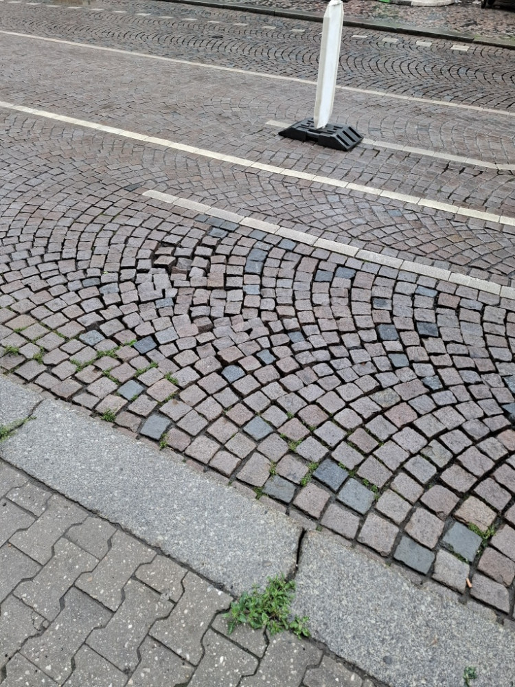 Rozvolněné dlažební kostky ve vozovce pred křižovatkou před domem Boleslavská 12, P3.
