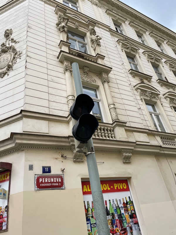 Roh Slezské a Perunovy (nesvítí zelený panáček na přechodu), přímo u ZŠ