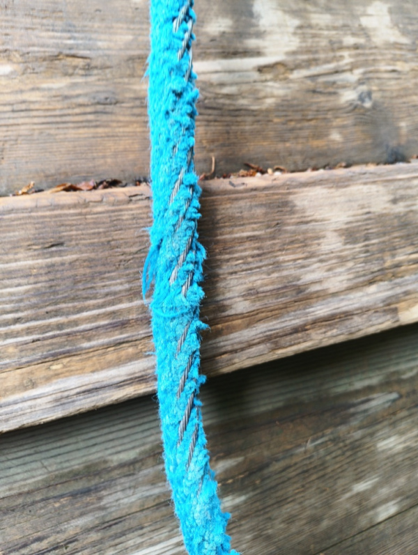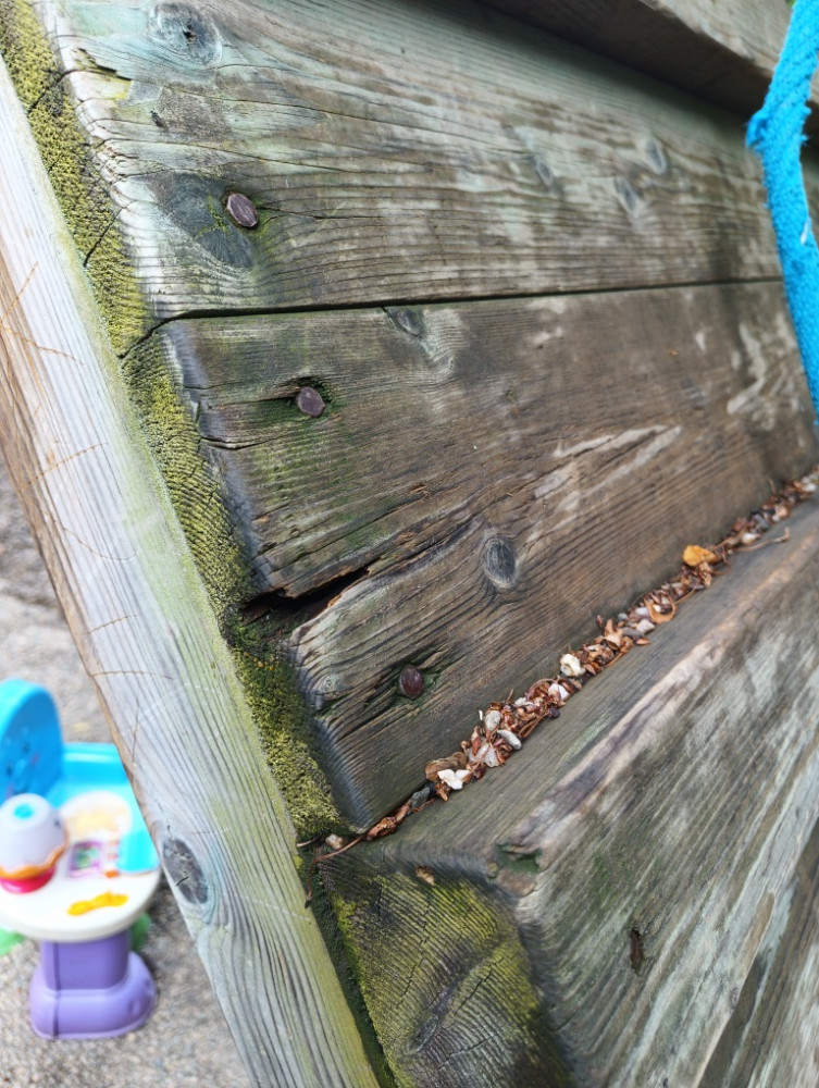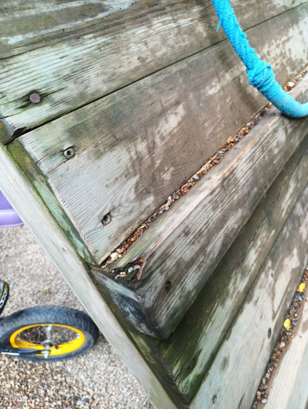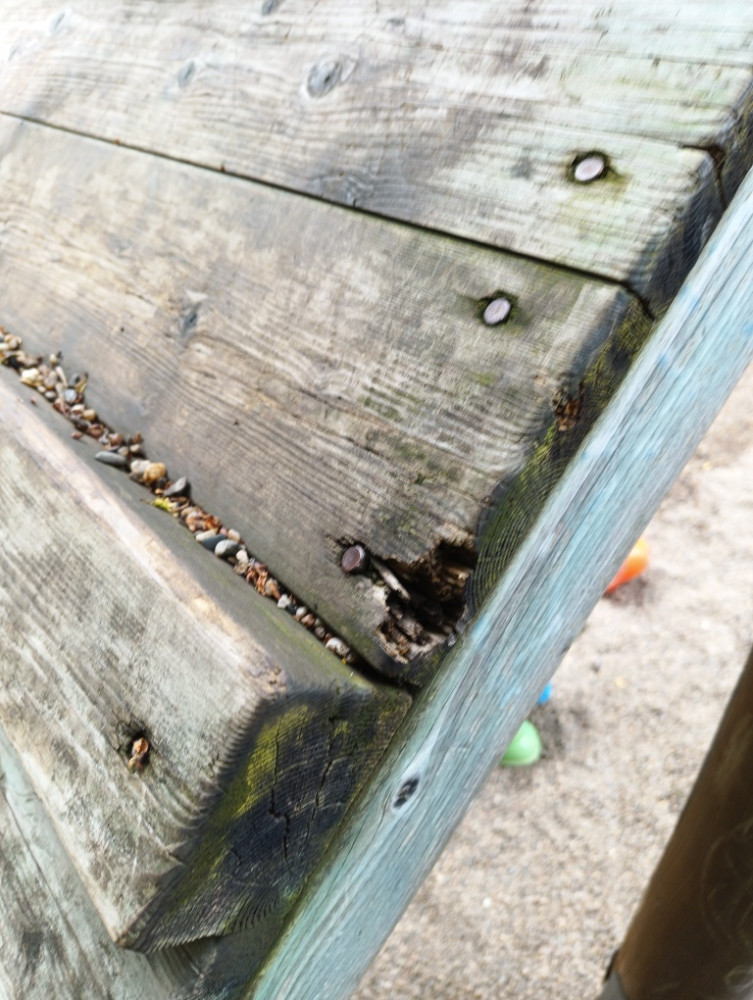 poškozený provaz u skluzavky začíná z toho koukat ocelové dráty plus poškozená část skluzavky ztrouchnivělé dřevo z důvodu špatně údržby že se neošetřuje možnost zranění děti