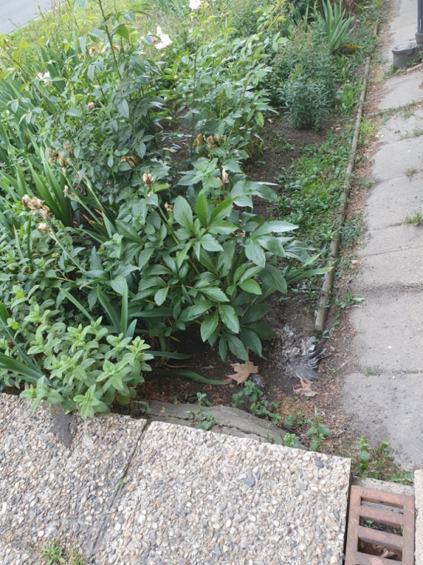 zbytky mrtveho holuba pred domem Hartigova 2456/241