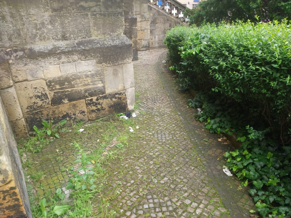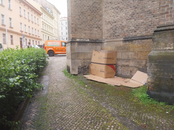 krabice po bezdomovcich a nepořádek okolo