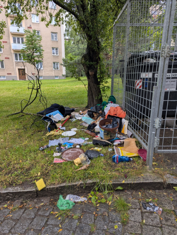 Neporadek u klece na komunalni odpad, za domem Hartigova 2499/246, za Albertem. Pristup od ulice Pod lipami.