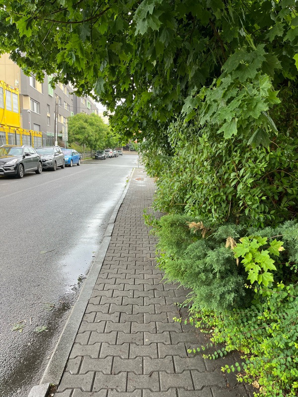 v ulici Na Vackově jde sotva projít kolem zeleně po chodníku v jednom, minout se s protijedoucím není možné bez vstoupení do vozovky
