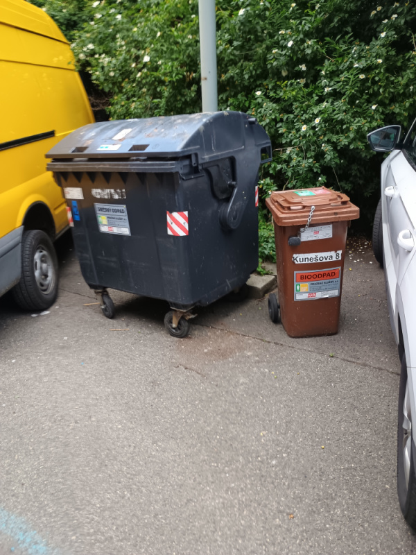 Okolo kontejneru taška s.nádobim a pytel nevím s čím.