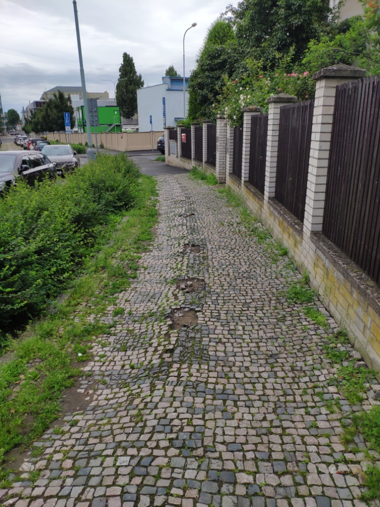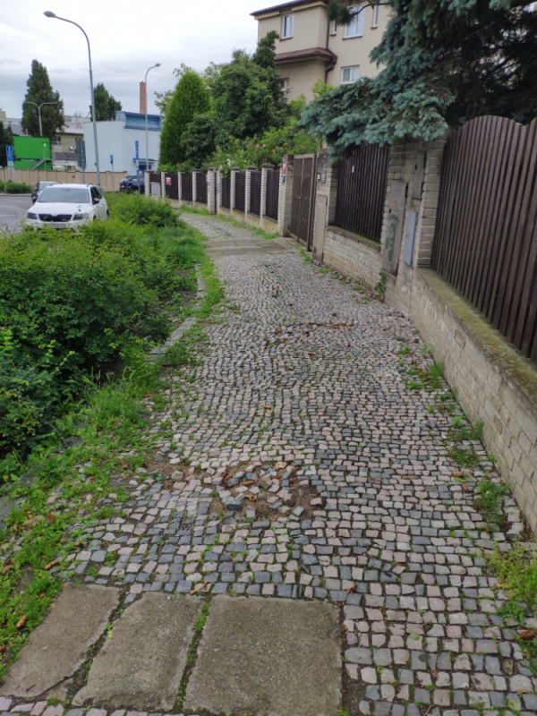 Chybějící dlažební kostky. Ulice Na Vápence 8