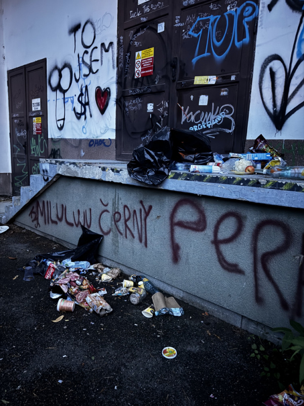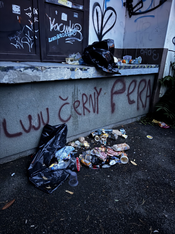 Nepořádek na komunikaci. Téměř skládka zřejmě po nějakém bezdomovci.