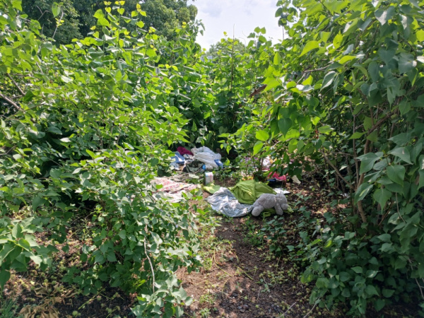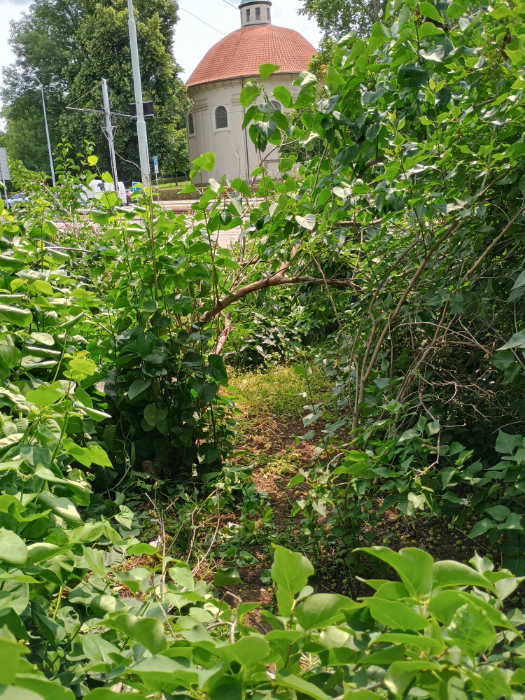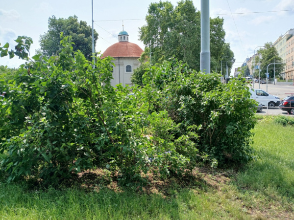 Olšanske nám. - hadry v křoví u květnového záhonu