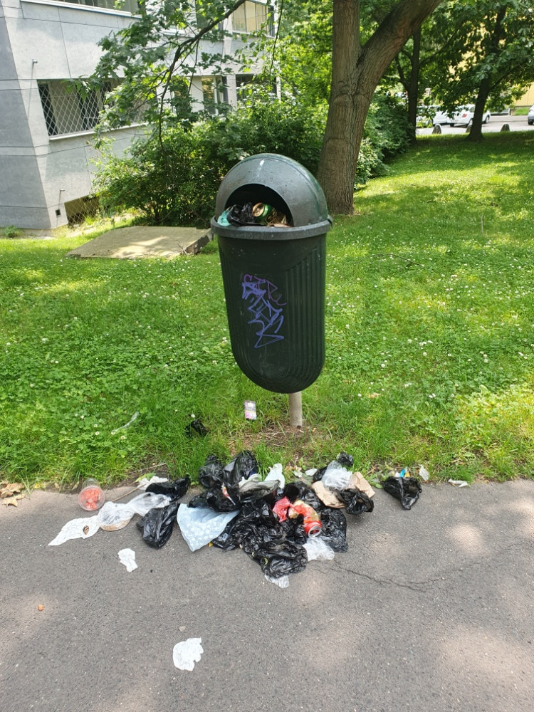 Vyházené odpadky z košů. Kousek vedle další koš také.