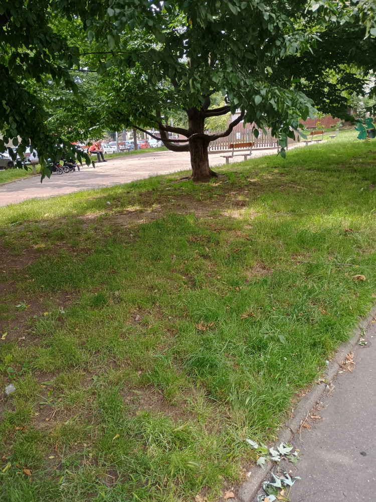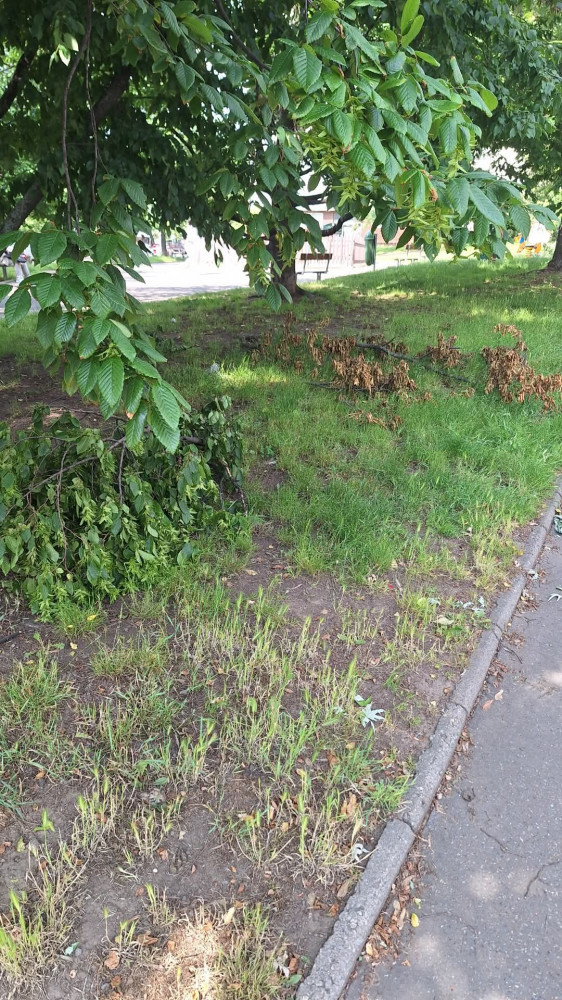 Na tom zeleném plácku před Vinohradskou nemocnicí někdo polámal velké větve stromů, ty tam teď leží.