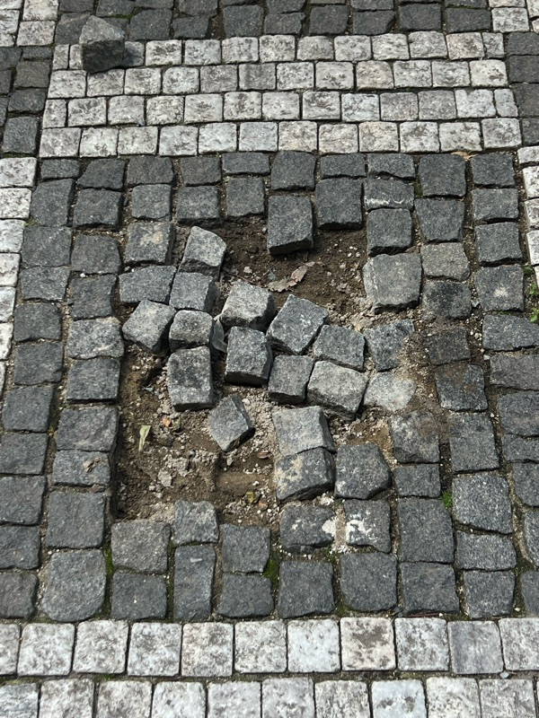 Vypadnuté kostky cca 30x30cm zcela, zakopává o to každý druhý člověk, před domem: Lucemburská 2015/28