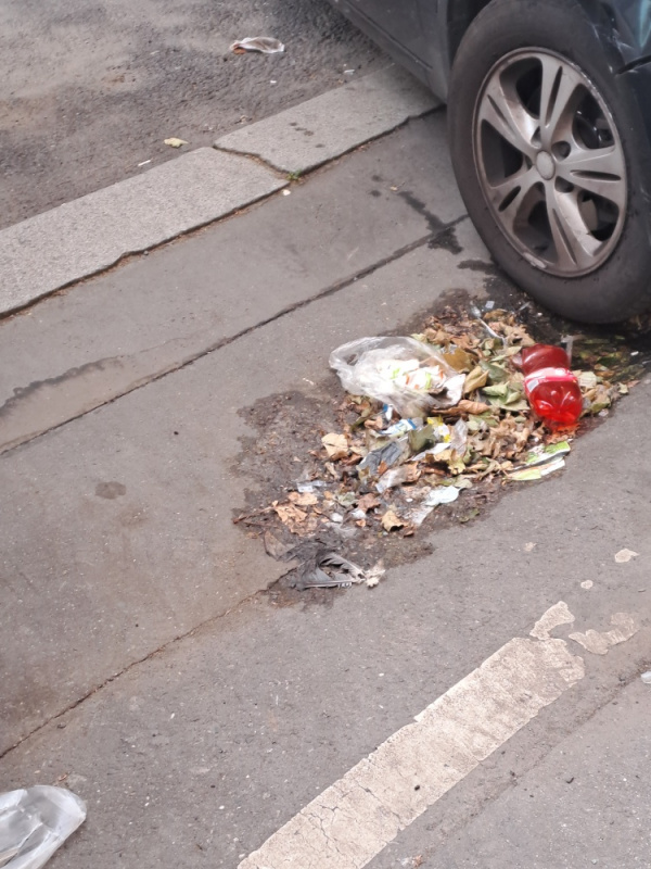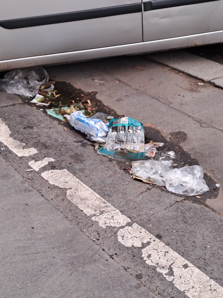 hromady odpadků mezi zaparkovanými auty před obchodem ovocem zeleninou Buchovcova