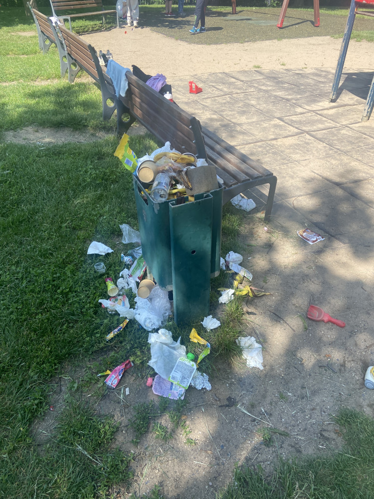 Plné koše a nepořádek už několik dní na dětském hřišti Na Balkáně.