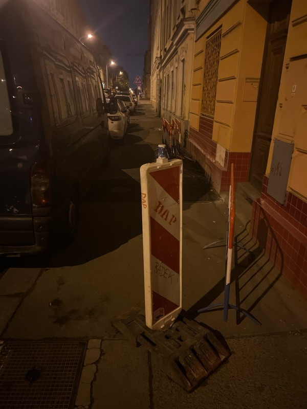Neuklízené dopravní značení již více než 14 dní, omezuje použití chodníku, zejména pak pro kočárky