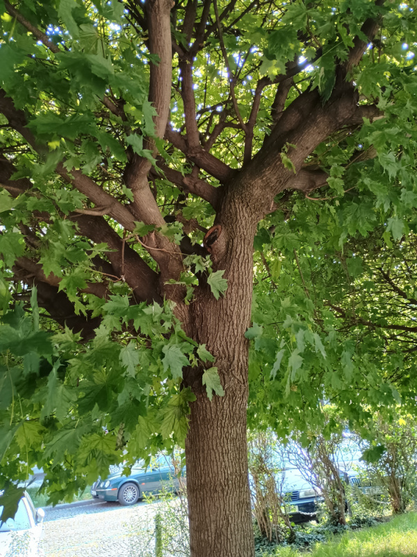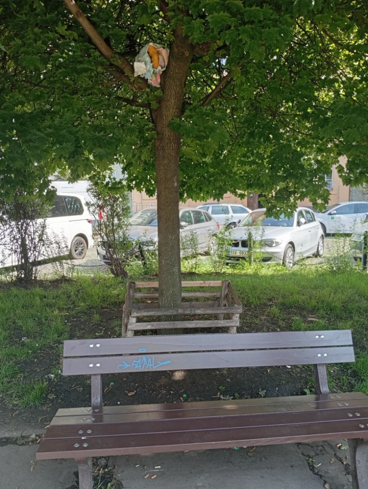 oběť bordel na stromě nad lavičkou kde je pocmarana modrou barvou