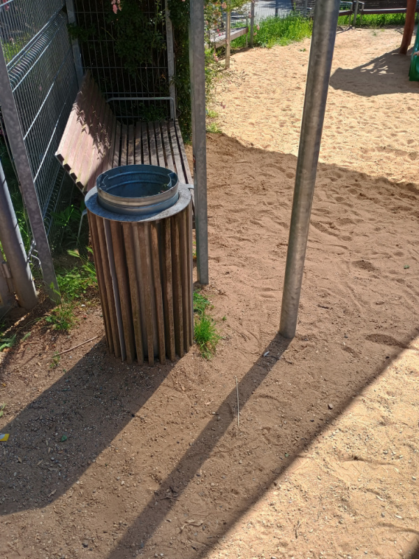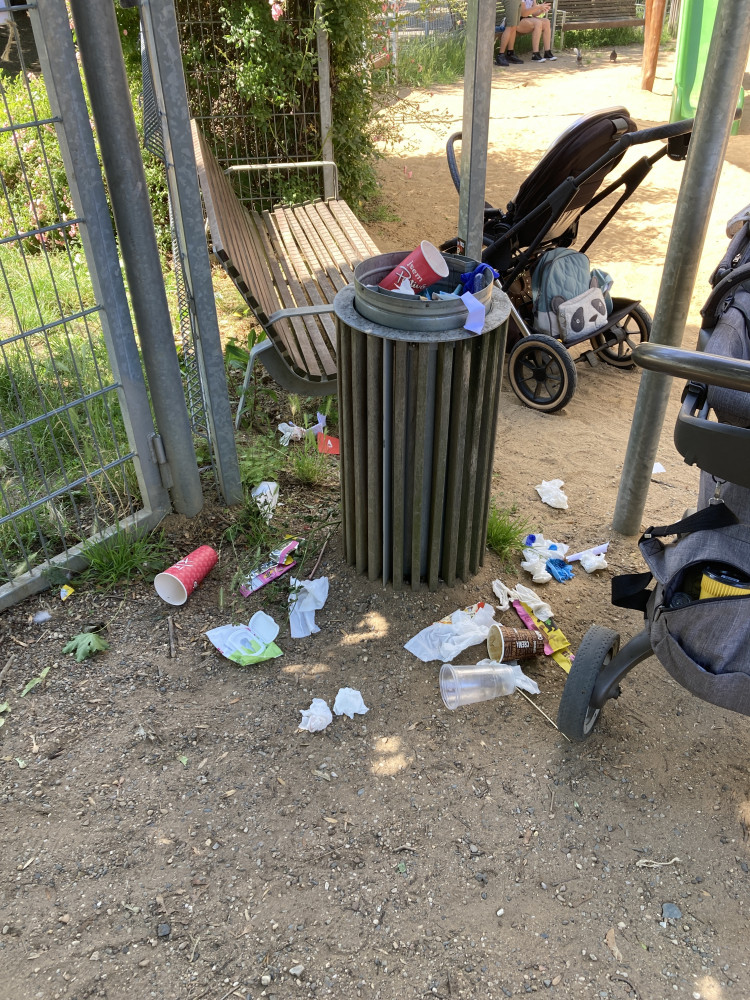 Vysypaný plný koš na hřišti na Parukářcce