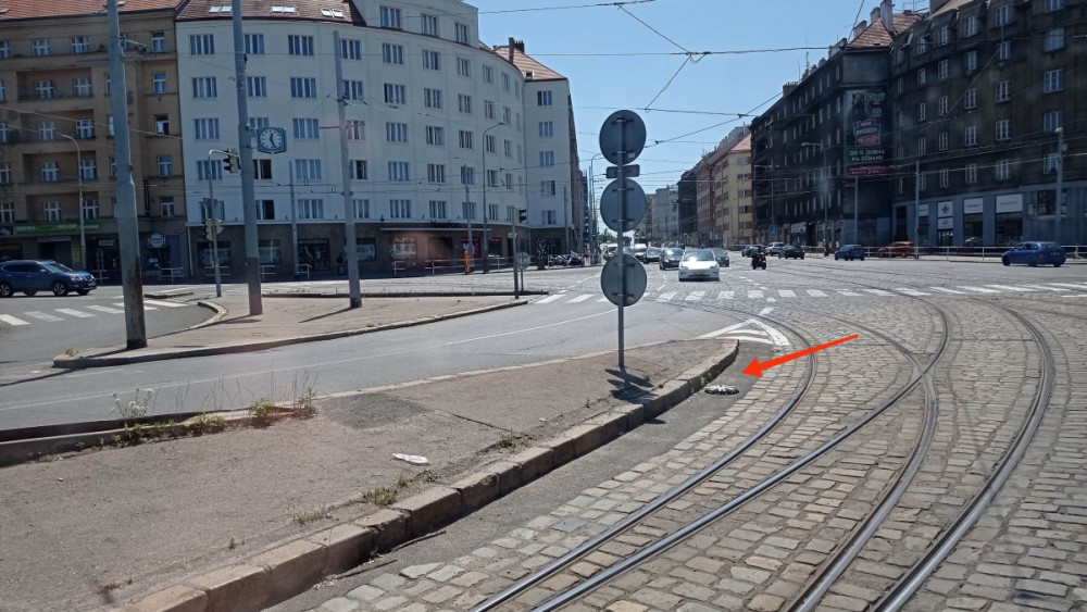Na křižovatce Pod Krejcárkem x Hartigova se nachází pohozená poklice od kola automobilu.