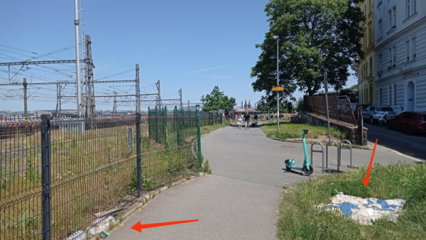 U konce cyklostezky A25 se u ulice Příběnická nachází pohozené odpadky, kartony a drobné plasty.