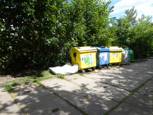 v ulici na Trebesine je u kontejneru na plast vyhozen velky bily pytel se strymi koberci.