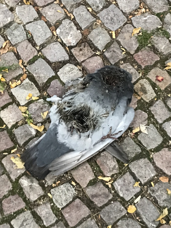 Mrtvi holub na chodniku, uz ve fazi rozkladu. Lezi tu nekolik dni. Hajkova 9