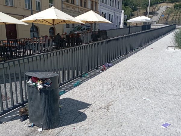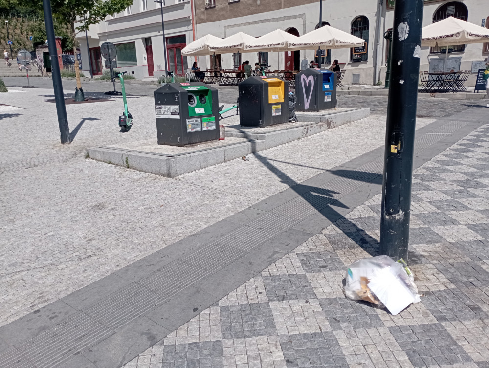 Na Tachovském náměstí zase létají odpadky z přeplněného odpadkového koše dolů tunelem a na všechny strany. Děje se to pravidelně, protože kapacita odpadkového koše naprosto nedostačuje míře využívání náměstí. Nešlo by tam přidat ještě jednu nádobu?