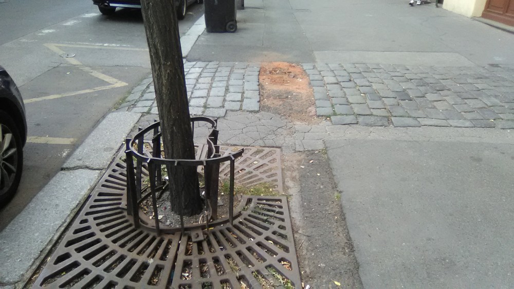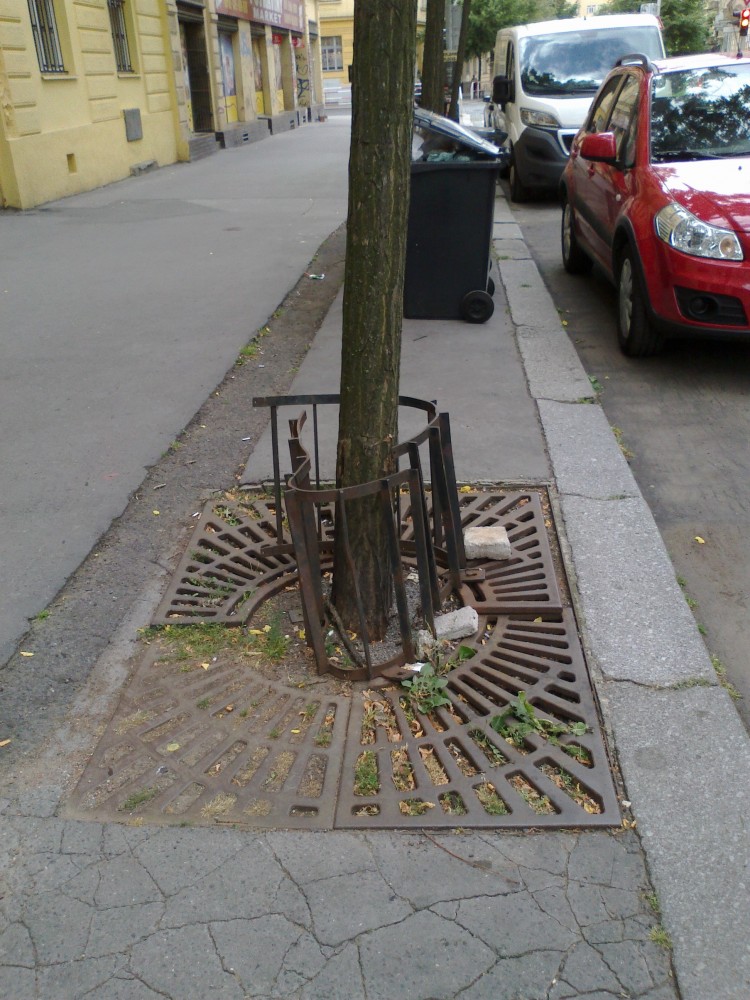 Poškozené hrazení kolem stromu; již hlásila cca rokem; + betonové odpadky. Před Slavíkova 12.