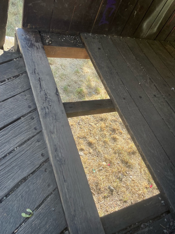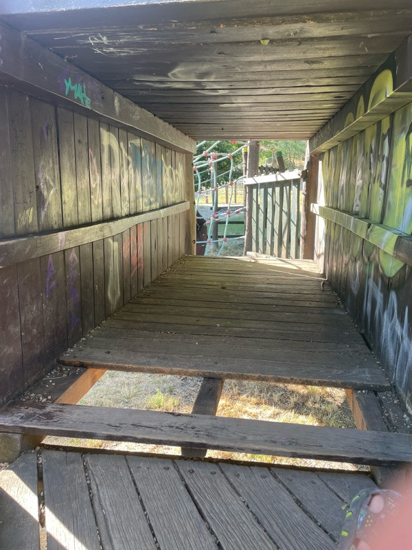 Chybějící desky v tunelu, je tam díra. Hřiště na kopci u velké skluzavky