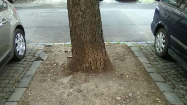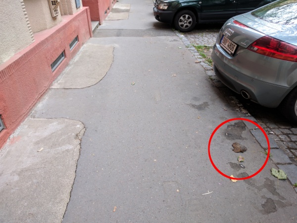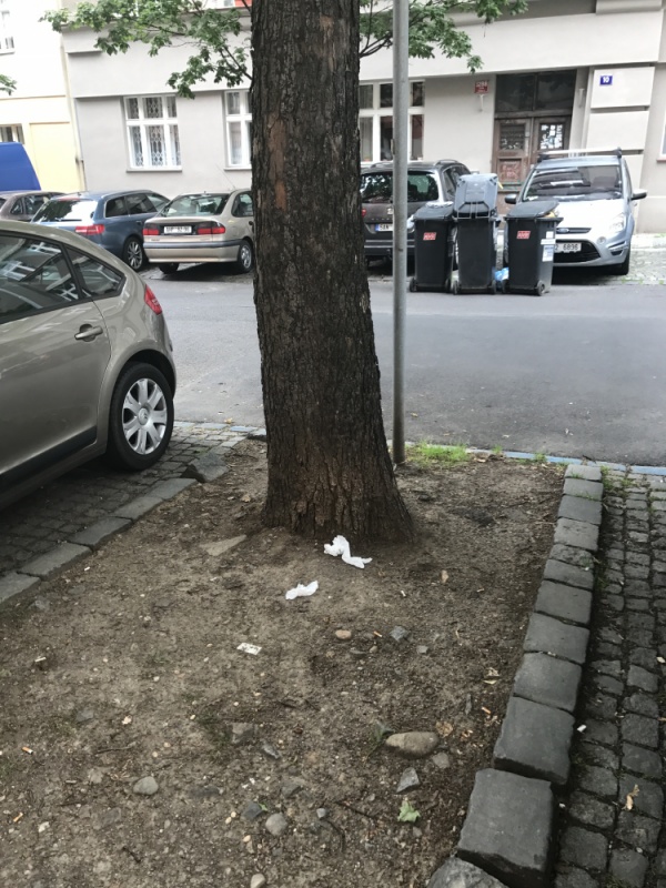 Psí exkrement na ulidi. A opodál při vedlejším stromu jsou pak nějaké odpadky.