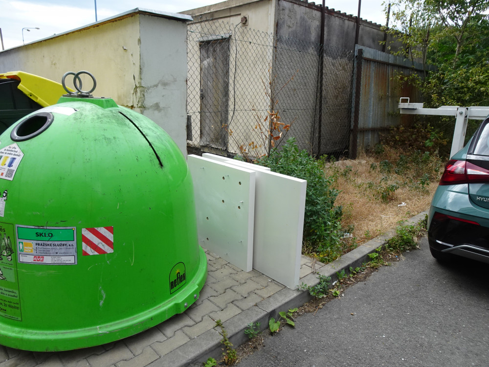 v ulici Zverinova u kontejenru na sklo jsou vyhozeny velke bile drevotriskove desky.