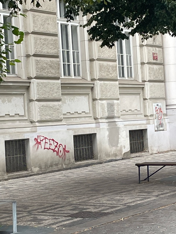 děkujeme za Váš podnět. Grafitti neodstraňujeme, musí si zajistit majitel objektu. Školu budeme informovat i když se domnívám, že již o problému ví.