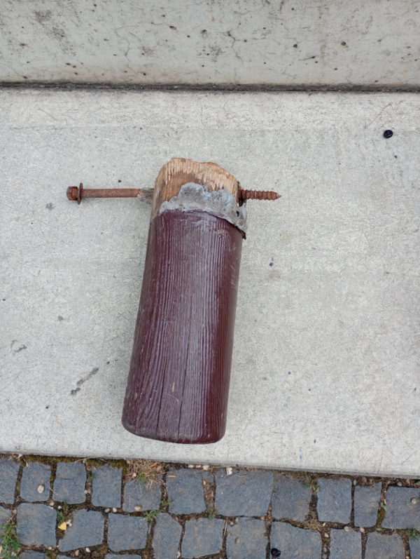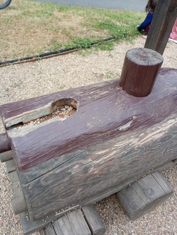 ulomený kus dřevěné atrakce vláček u dopravního hřiště pece