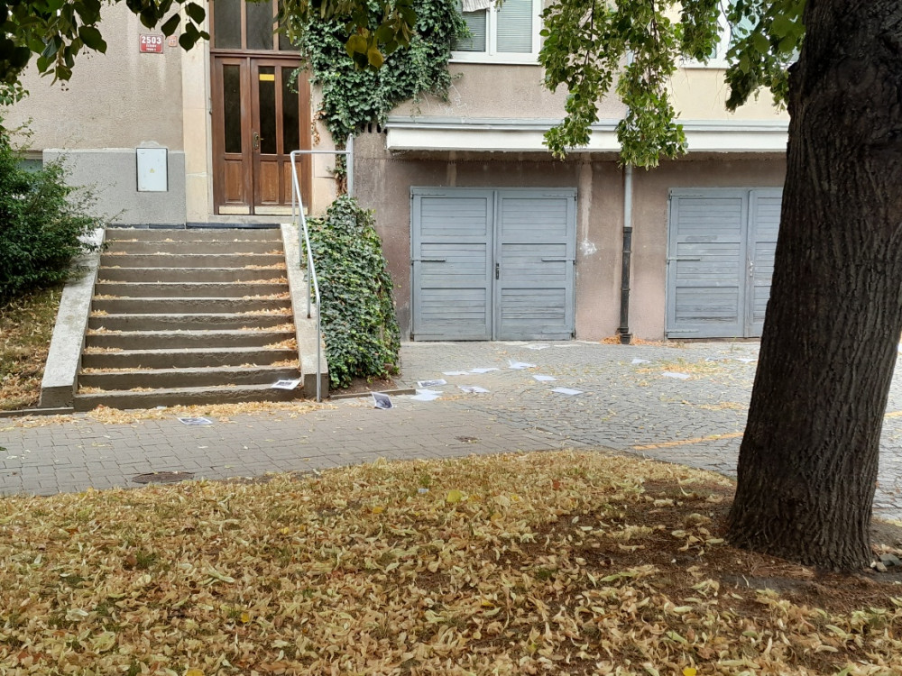 Rozházené nebo větrem rozfoukané papíry na chodníku, trávě, mezi auty.