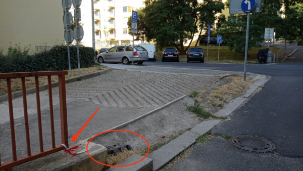 V ulici Jeseninova se u jedné z propojek do ulice Žerotínova nachází odložená odlomená polovina podstavce po přenosné DZ.