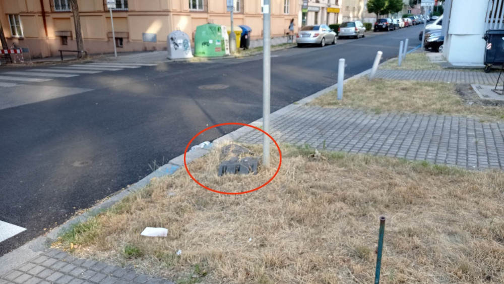 Na křižovatce Jeseninova x Domažlická se nachází odložený na dva kusy rozlomený podstavec po přenosné DZ.