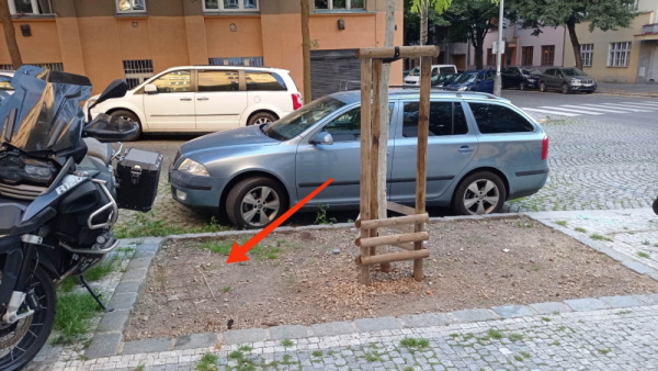 Na křižovatce Hájkova x Žerotínova se v rabátku s mladým stromem nachází pohozený kus kovové kari sítě.