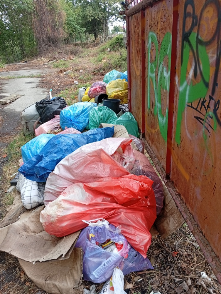 je tady nepořádek v pytlích zřejmě připravene na odvoz . je to místo kde se schází lidé bez domova