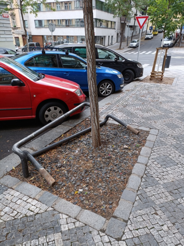 Po zasazení nového stromu nebylo vráceno ochranné zábradlí, které se povaluje u vedlejšího stromu.