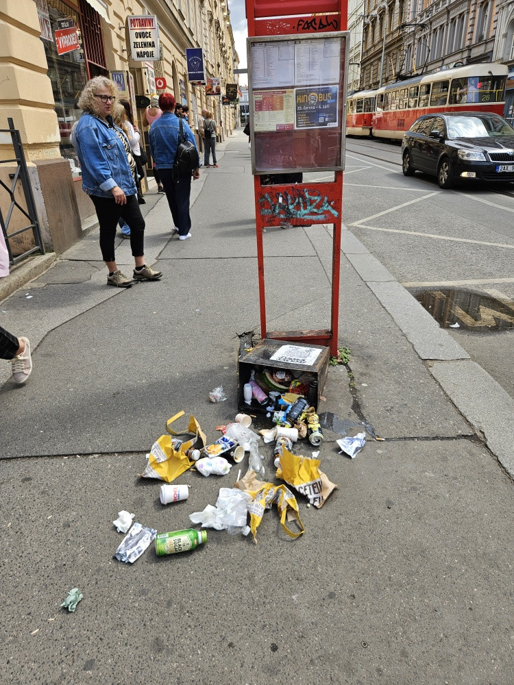 vysypaný koš na zastávce tram Lipanská směr centrum