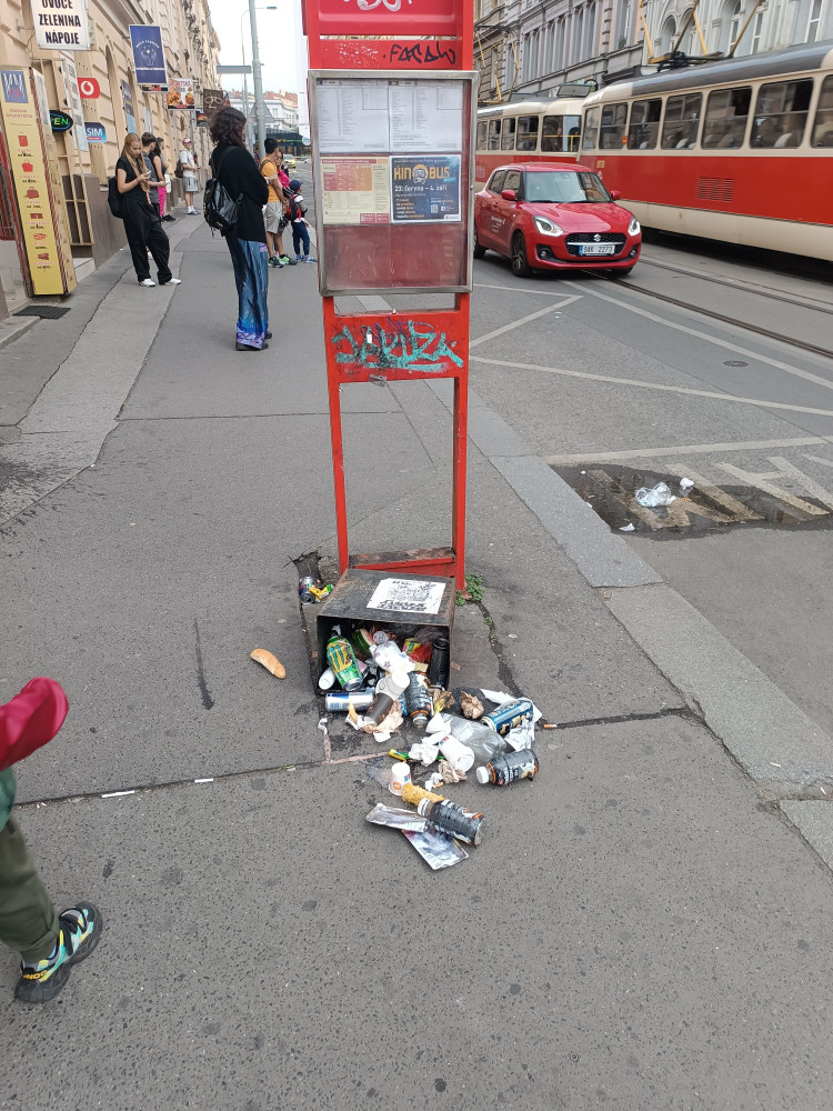 Převezený koš na zastávce Lipanská, směr centrum