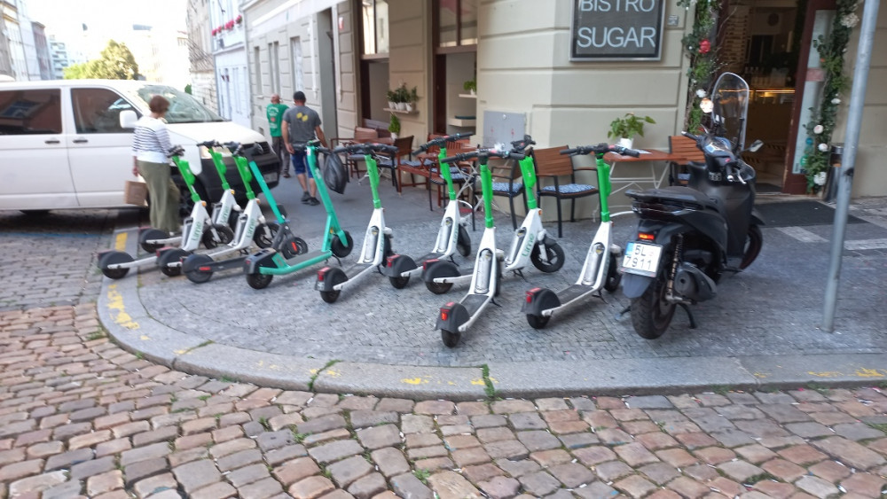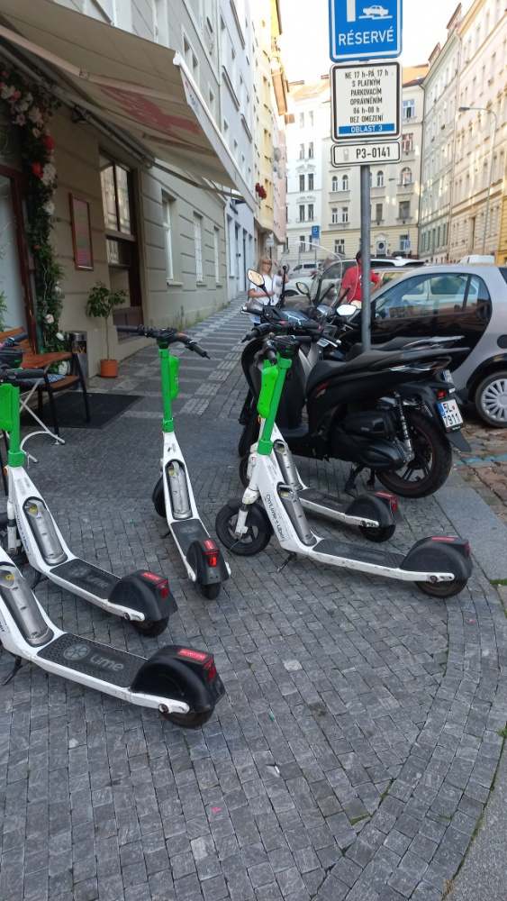koloběžky v chodníku u rest.sugar,
