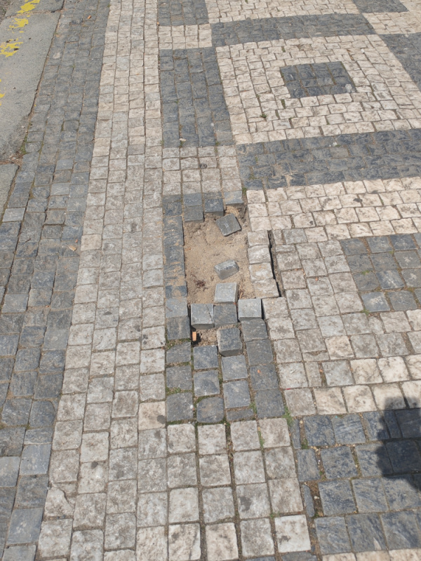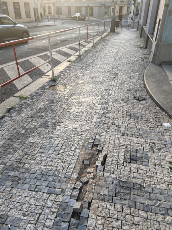 Dobrý den, na chodníku na dvou místech jsou vypadané dlažební kostky a kostky se ruzne presouvaji po chodnika a silnici a je to celkem nebezpecne. Je to na Prokopovo nam. 2 a Prokopova 18.