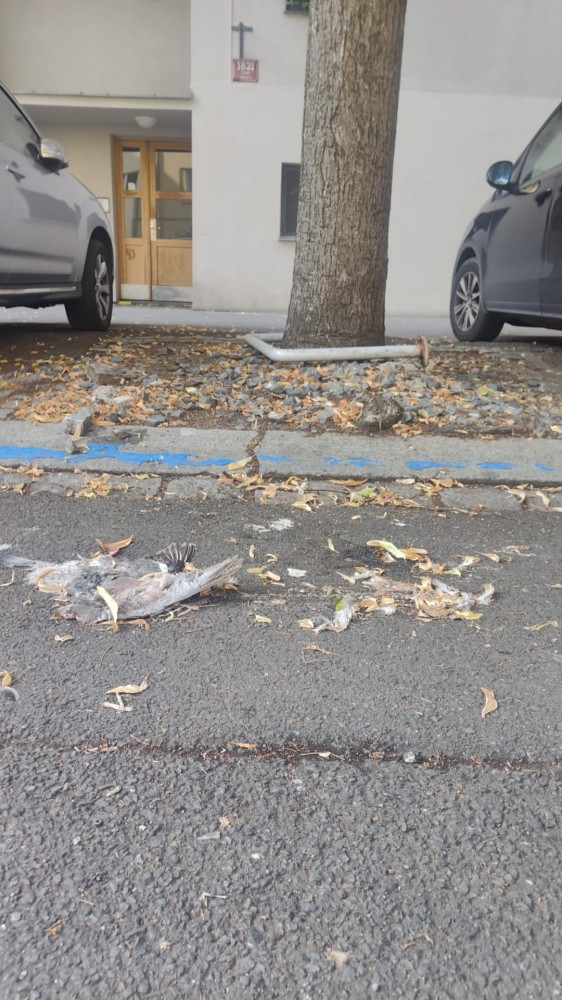 rozježděný mrtvý holub na ulici před domem Lucemburská 36. Pozor holub je obsypán hmyzem a vosami.