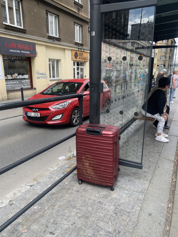 Odhozeny prázdný kufr u tramvajové zastávky Biskupcova smer centrum