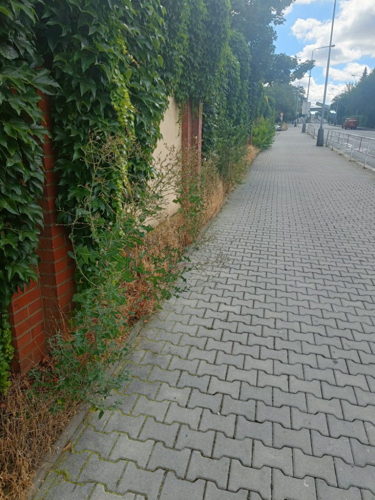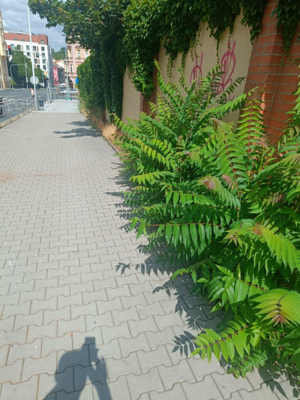Neudrzovany pas zelene u zdi u skolky v ulici Prokopova. Roste tam nalet invazivnich pajasanu. Nikdo dlouhodobe neudrzuje.