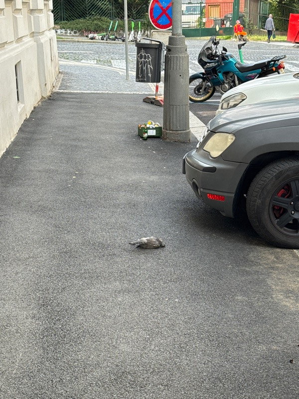 Na konci ulice vlkova na chodníku leží mrtvý holub.