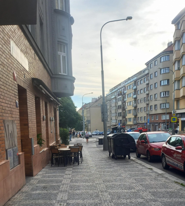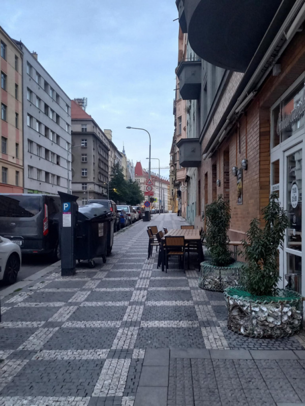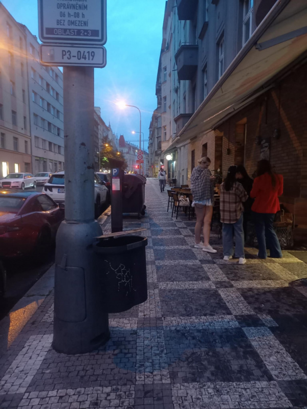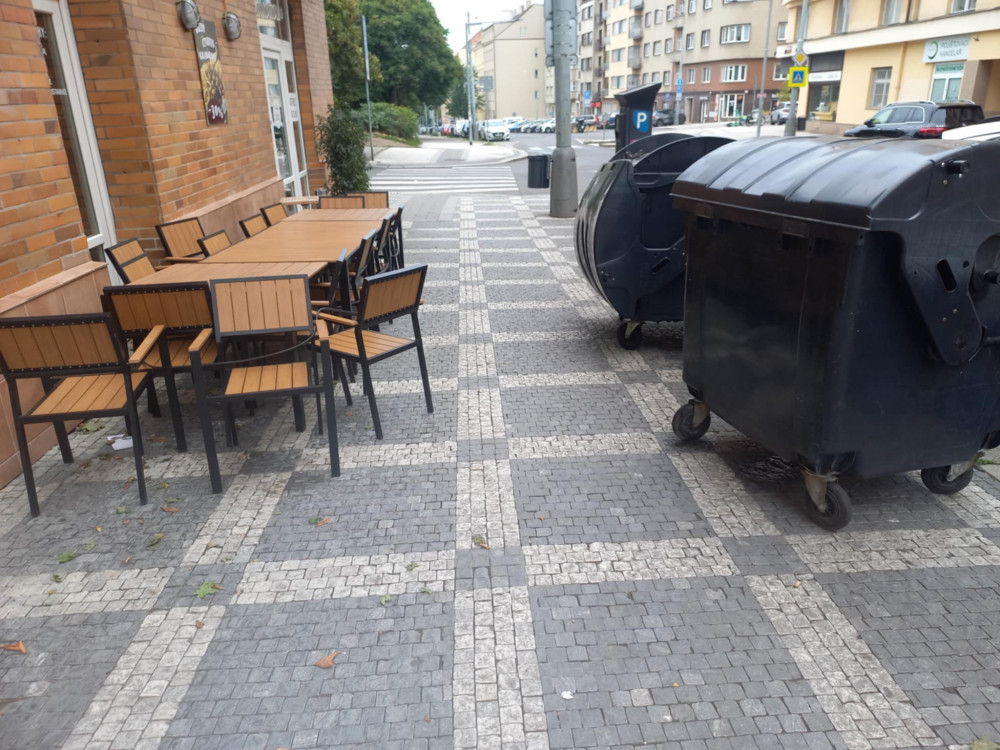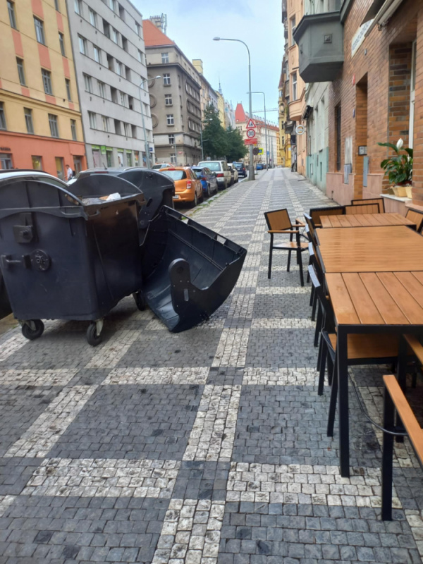 Váš argument, že "Domnívám se, že kontejnery jsou venku jen kvůli vývozu/závozu." bohužel neodpovídá stavu, kontejnery jsou tam permanentně (viz foto) bez ohledu na den v týdnu či denní dobu. Že někdo hosty své restaurace posadí vedle popelnic, mi nepřísluší komentovat, ať už si o tom myslím cokoliv, ale průchodnost pro chodce je zcela jednoznačně ztížena. Není přece z povahy věci možné zabrat půl chodníku venkovním sezením a třetinu kontejnery. Pokud můžete pomoci zjednat nápravu, budu vám vděčna. Děkuji. B. Bellová