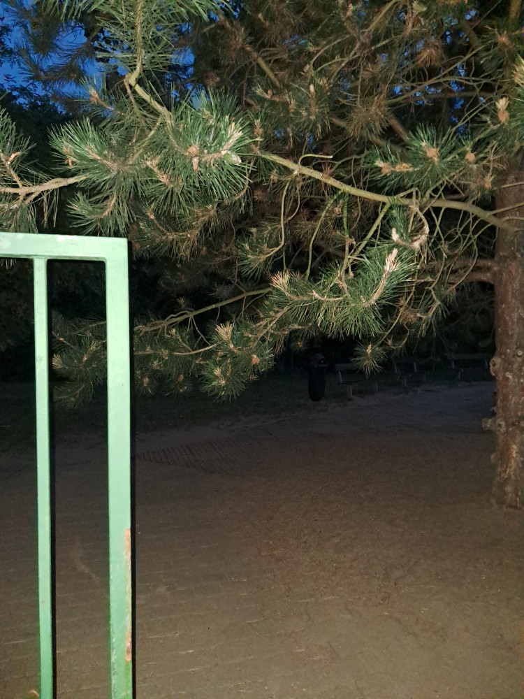 Porost borovice zasahuje u vchodu do hřiště a na záchod,hřiště Habrova