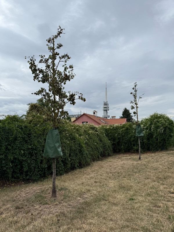 Pro doplnění, stromy zaléváme dle stáří stromů a podle počasí 14 až 16 krát ročně od března do října, v létě 2 až 4 krát měsíčně dávkou 80 až 100 l. Voda ve vacích zůstává jen určitou dobu po zalití.
