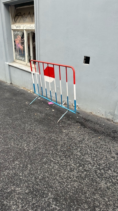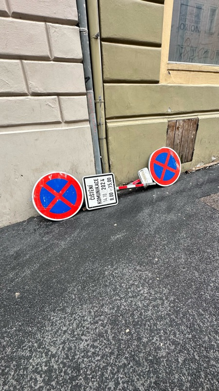 na ulici jsou značky a dopravní zábrany, které zde leží již několik měsíců, viditelně s datem z roku 2024